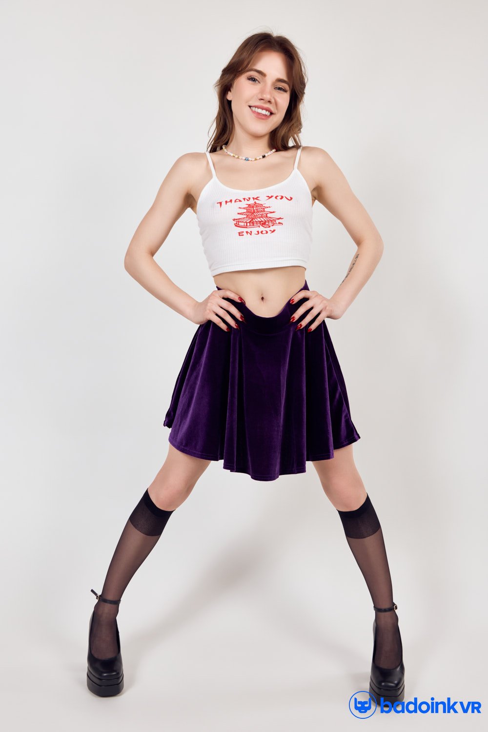 The enchanting VR star Carolina Guerrero materializes right in front of you, so close you can feel the warmth radiating from her sun-kissed skin. Her tight red top clings to every curve, while denim shorts barely contain her firm, round ass. She shyly admits she wore this scandalously revealing outfit just for you, her voice a sultry whisper that seems to wrap around your cock. But don’t rush—this is VR porn at its most immersive. Carolina teases, spinning slowly as she slips in Spanish phrases, her body moving with a hypnotic rhythm that makes your dick throb with anticipation. “¿Te gusta mi baile solo para ti?” she purrs, asking if you like her dance just for you. Every detail is captured in stunning 8K resolution, from the glisten of sweat on her collarbones to the mischief dancing in her eyes, making you feel like you could reach out and touch her.